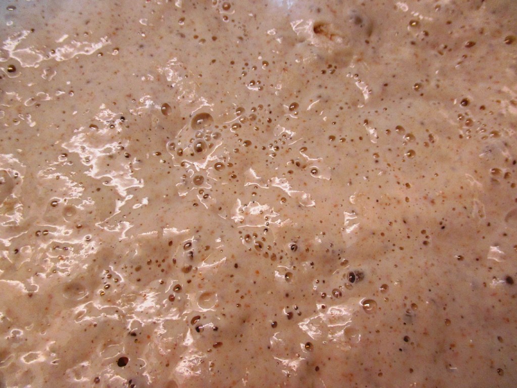 Yeast are tiny, one-celled fungi. Sourdough yeast is more tolerant of varying environmental conditions such as temperature and acidity than baker’s yeast. When yeast have access to oxygen, aerobic fermentation produces carbon dioxide gas (CO₂), which bubbles through bread dough, making it rise. Yeast fermentation in the absence of oxygen (anaerobic fermentation) produces alcohol. A sourdough culture that has been left to ferment for a long time without being aerated will develop a thin layer of alcohol (hooch) on the surface. The alcohol provides an additional flavor dimension.
